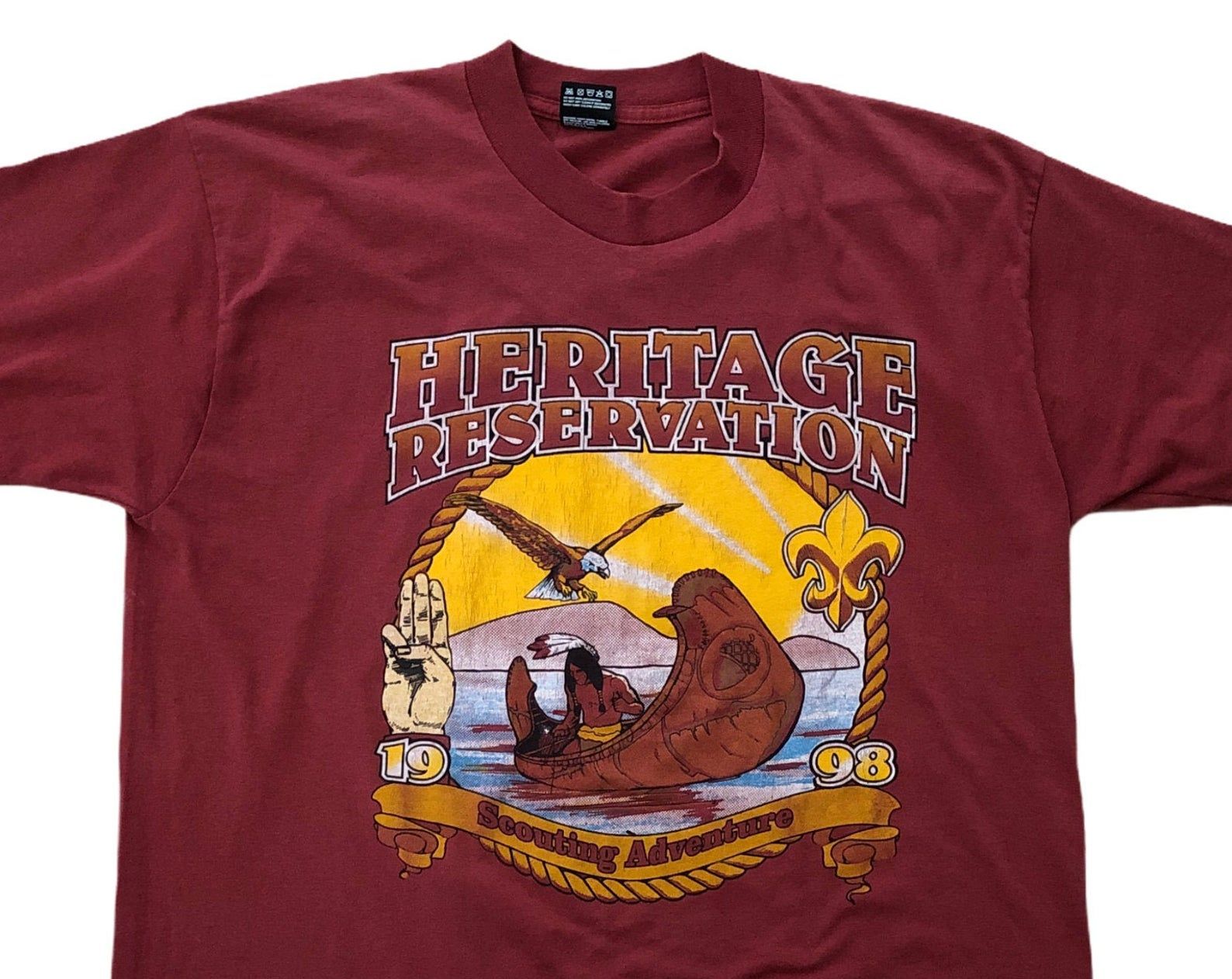 Have a look at the detailed information about Heritage Reservation 1998 Scouting Adventure Vintage 90S Boy Scouts Of America Bsa Farmington Pennsylvania Fotl Best Graphic Red T-Shirt below!