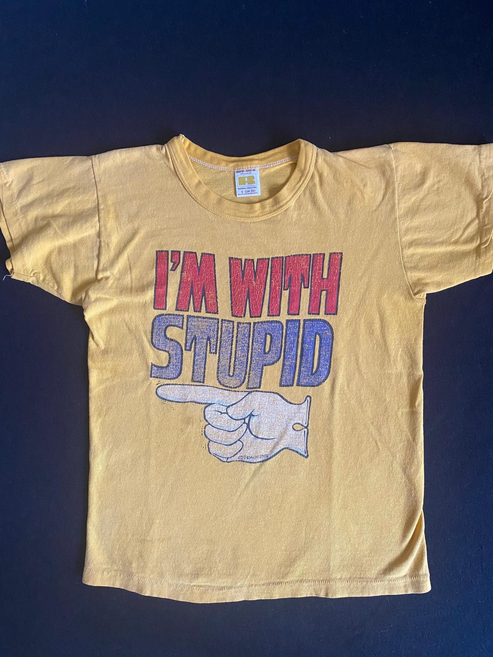 I'M With Stupid 1975 Iron On Classic 70'S Silly Statet T Shirt Soft And Worn Gold Yellow With Red Black Graphic Xxs