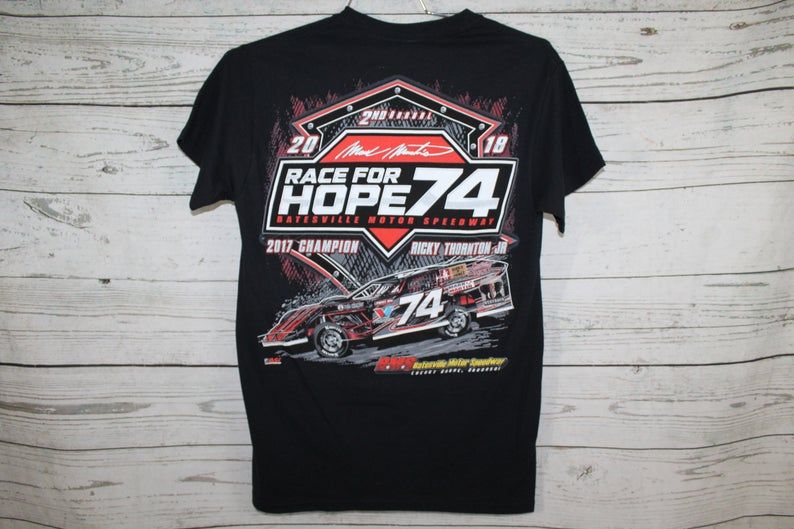 Have a look at the detailed information about Mark Martin Ricky Thorton Race For Hope Batesville 2018 Double Sided Large Graphic Shirt below!