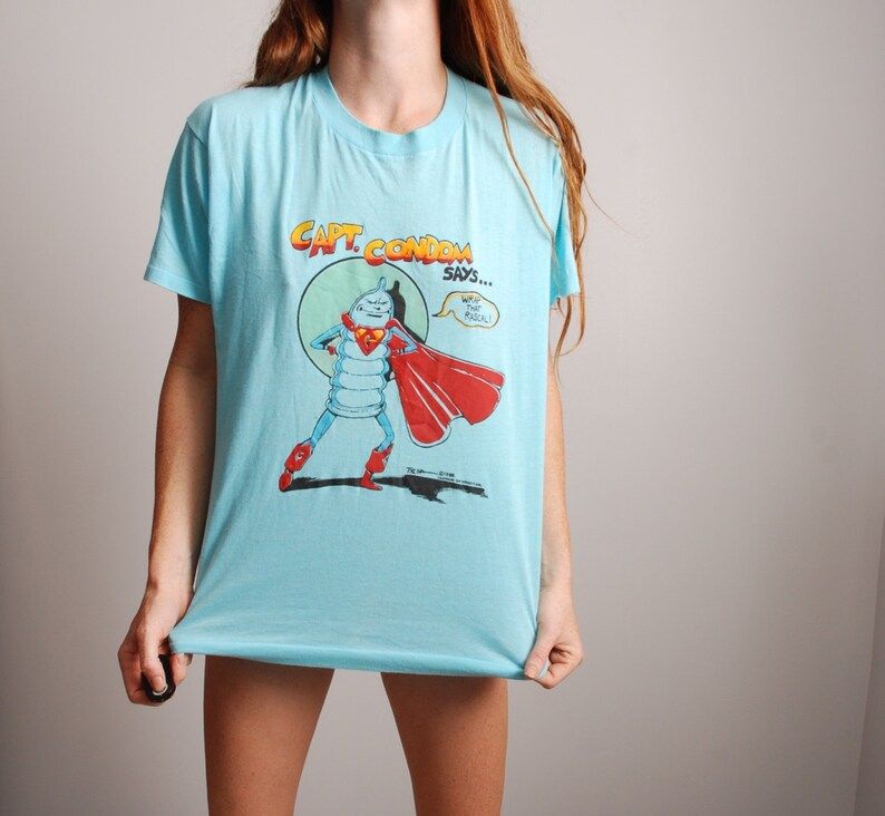 Reserved 80S Screen And Stars Large Funny Condom Comic Blue Tee T Shirt Top Tyler 1988 Fashion Graphics Inc