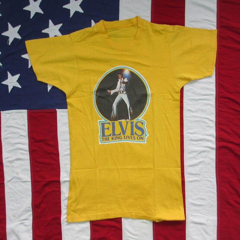 Have a look at the detailed information about Vintage 1970S Elvis Presley The King Of Rock Roll Memorial T Shirt Xs Transfer Well Worn Soft Thin Yellow Single Stitch Tex Cotton Poly below!