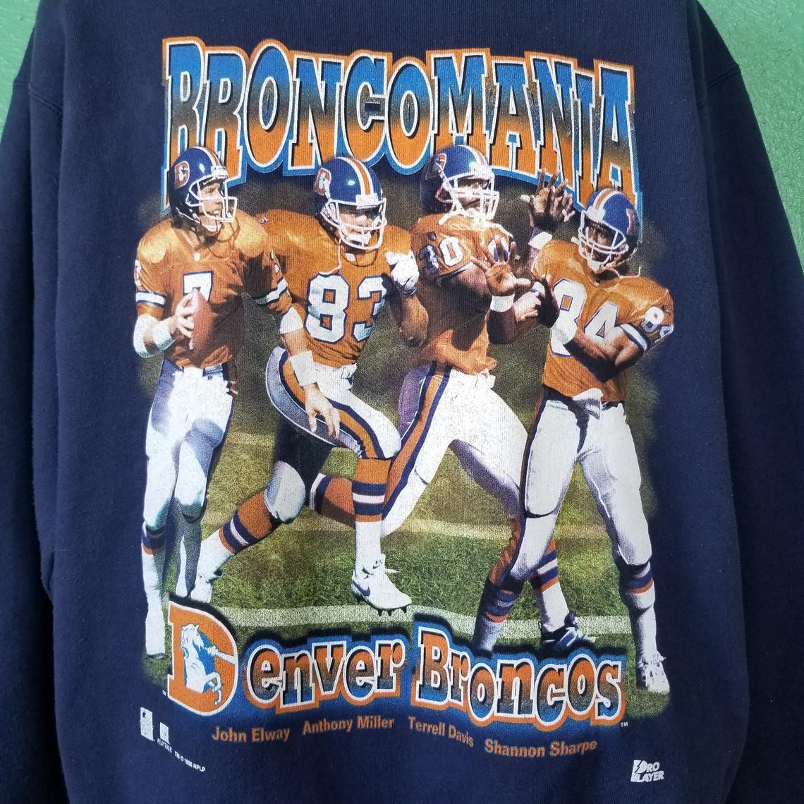 Have a look at the detailed information about Vintage 90s Denver Bronco Mania Pro Player John Elway 1996 Shirt below!